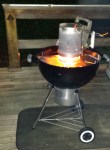 Smoking sausages means using indirect heat (coals on the sides of the grill and food in the center) and placing some well soaked wood chips (I used hickory this time) on the live coals to create the smoke. No peeking, no turning, no nothing, and in 30 minutes you have some mahogany beauties ready for chowing down.