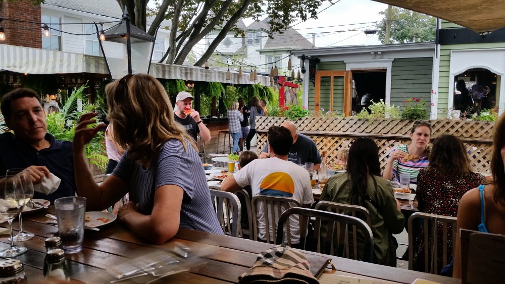 You might think that 3 1/2 dozen oysters and some tasty stout would prove satisfying. It did, but it was not filling. So, we walked over to the 1943 Pizza Bar in Stirling Square, for what we think is the best pizza anywhere. The crust is thin and crisp, the toppings fresh and delicious, and the service friendly and accommodating. We were not the only ones in Greenport with pizza on the brain. With a 45 minute wait, we shopped until we got the “come and get it” text. Weather permitting, you can dine alfresco, or sit inside. We chose the best of both worlds, sitting in the large picture window and enjoying the view.